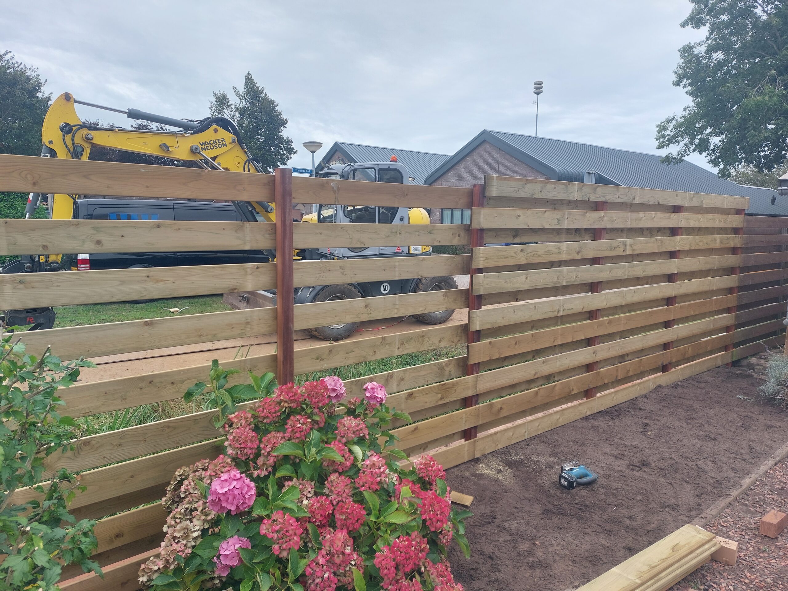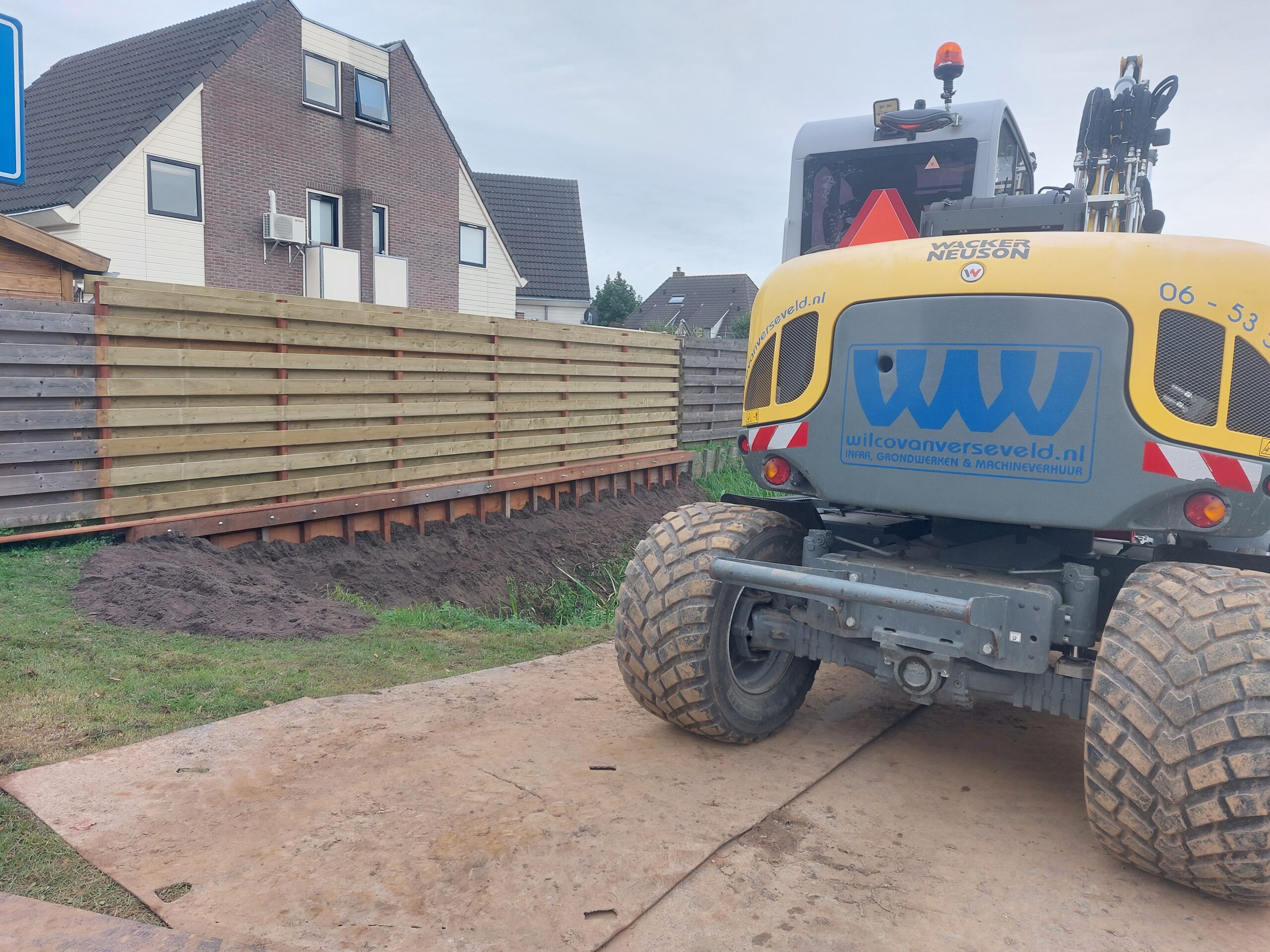 Een schutting die geplaatst word op een beschoeiing.